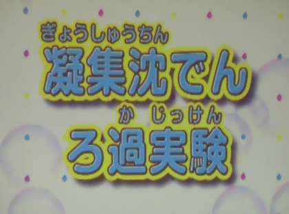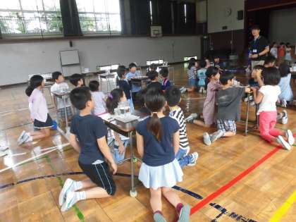全体での学習が終わると、グループごとの実験を通して、学んだことを確認しました。今日の実験は「凝集沈でんろ過実験」です。水道キャラバンの先生方にていねいに説明していただき、子供たちも早く実験に取り組みたい意欲を見せていました。いよいグループ実験です。