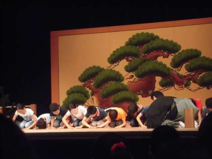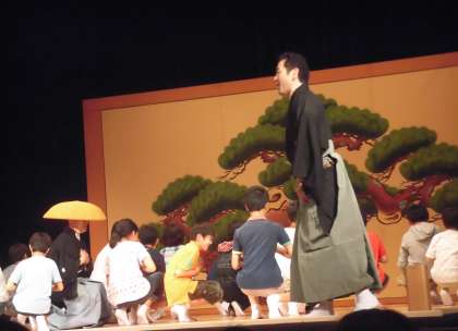 狂言では人間以外のたくさんの動物や植物も登場し演技を行うそうです。ワークショップでは、きのこが登場し、すり足のような歩き方を体験しました。最後に正しい姿勢の「礼」してワークショップが終了しました。その後は、狂言「附子」の鑑賞です。「心で感じて、見えないものを想像しながら鑑賞を楽しみましょう」そんな言葉をいただきました。心で鑑賞する・・・とてもすてきな言葉です。みんな一生懸命に言葉を理解しようと聞き入っていました。楽し場面では思わず笑いがこぼれました。