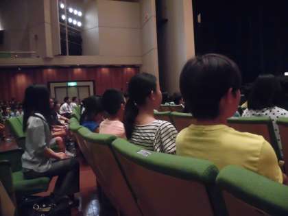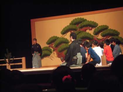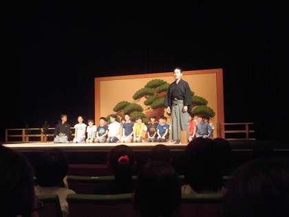 区民会館に着き、鑑賞教室がはじまると最初に「狂言」についてのお話をうかがいました。その後は、ワークショップの形で狂言の味わい深さを体験しました。今日は世田谷区民会館に世田谷区立小学校7校が集合しました。その7校の各学級1名ずつが舞台に上がり「狂言」を体験します。会場にいるみんなも姿勢を正したり、座ってできる演技をしたり、大きな声でセリフを言ったりと楽しい時間になりました。池之上小学校は、心の劇場(劇団四季)に引き続き、正面一番前の席です。演技の表情がしっかり伝わってきます。
