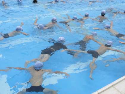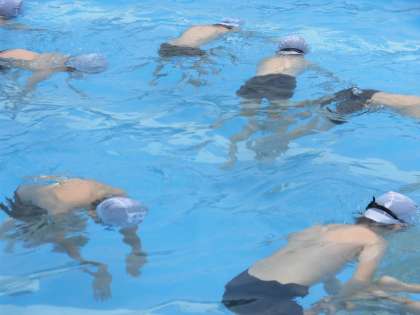 「浮く」練習です。だるま浮き・大の字浮き・クラゲ浮き・ラッコ浮きなど、様々な形で浮きました。ラッコ浮きでは、おへそを前に出して、耳を水に近づけるといった浮き方のこつを先生が伝えました。そのこつを使って、上手に浮く子がたくさんいました。