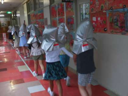 6月の避難訓練が雨で延期になったため、本日、6月分の避難訓練を実施しました。今日の訓練は火事を想定しています。校内放送で通報が入ると、校庭に避難します。子供たちはお話をしないで、ハンカチでしっかり口を押させて行動しています。訓練を積み重ね、いざというときに備えていくことの大切さを理解し、まじめに避難訓練に取り組むことができました