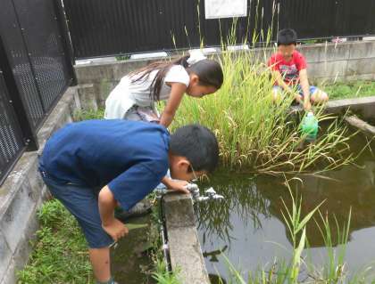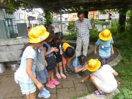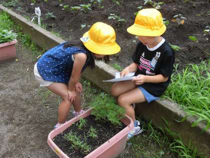 裏庭では、あちらこちらで自然を観察する子供たちがいました。興味を示す対象はそれぞれ異なるようですが、自分の好きなものを観察する子供たちの集中力はすばらしいと思いました。