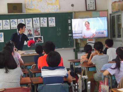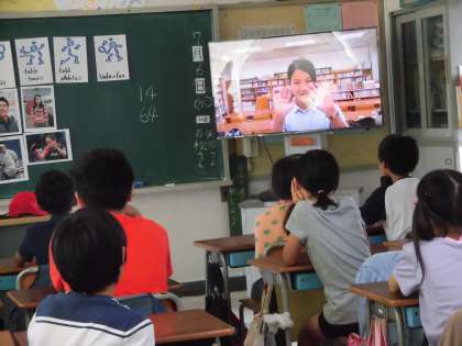 今日の授業では、世田谷区の先生がビデオで特別出演しました。先生たちが、名前や好きなスポーツなどを英語でスピーチし、その内容を子供たちが聞き取りました。池之上小学校の英語担当の先生も登場しました。子供たちは興味津々です。引きこまれる顔には、笑顔もいっぱいありました。