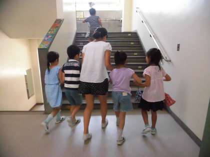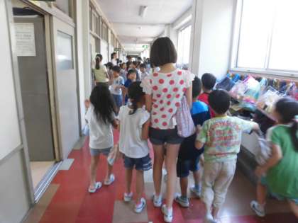 7月11日、なかよし班活動が行われました。今日は、なかよし班で一緒に給食を食べます。給食の後は、みんなで仲良く過ごすなかよし班遊びの時間です。6年生の班長さんたちは、この日のためにいろいろな打ち合わせをしてきました。そんな6年生は、なかよし班の活動場所まで1年生を案内しました。いつも優しく接してくれる6年生のことが1年生は大好きです。6年生と一緒に活動場所まで移動しました。