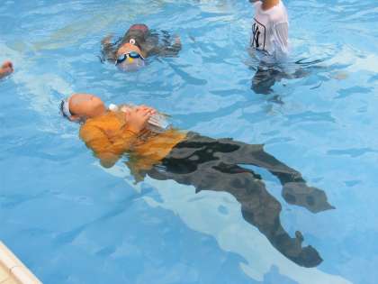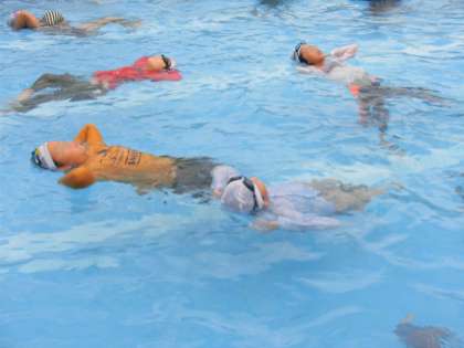 ペットボトルを使うと水に浮きやすくなることを実際に確かめました。おなかの上で持ったり、首の後ろに置いたりしています。ペットボトルがあることで、ずいぶん浮きやすくなることを実感した子供たち。おなかや首以外にもいろいろな部分で浮き方を確かめていました。