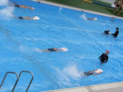 5・6年生の水泳指導が行われました。一生懸命に練習しています。高学年は、ビート板を使ってバタ足の練習です。