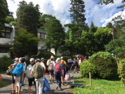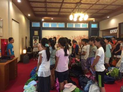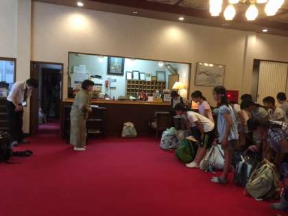 宿舎に着きました。お世話になる皆様にしっかりごあいさつをしました。栃木弁を教えていただき、和やかなひとときになりました。「暑い1日でしたが、大丈夫け?」と声をかけていただくと、子供たちは元気に「大丈夫、大丈夫!」と答えます。2回繰り返すのが栃木弁の特徴だそうです。代表の子供が「チーム6年生でがんばります。」と力強く述べました。