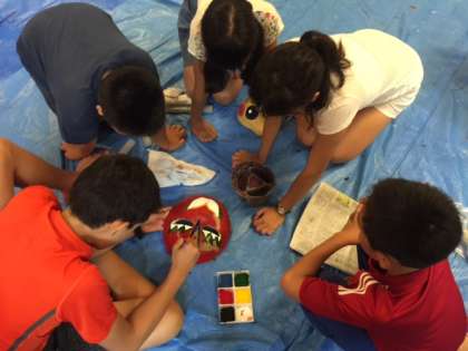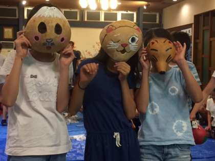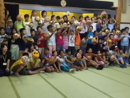友達を応援する子供たちと作品の数々。みんなで記念撮影!