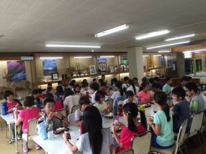 お昼になりました。天気予報で午後から雨の予報が出ていたので、昨日のうちからレストセンターでお弁当の時間をとれるように予約していました。ちょうど出発間際に大雨が降ってきました。子供たちが雨にぬれず、ほっと一安心。これから足尾銅山に向かいます。