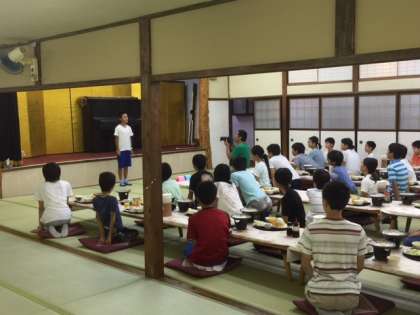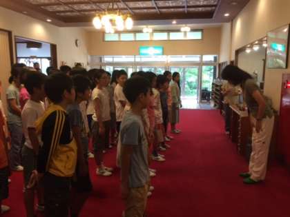 おはようございます。日光林間学園3日目の朝を迎えました。6時の起床時には雨が降っていたので、朝会はロビーで行いました。限られた空間でしたが、ラジオ体操で目覚めの運動。先生からは「感謝」をテーマに話がありました。朝食もおいしくいただきました。