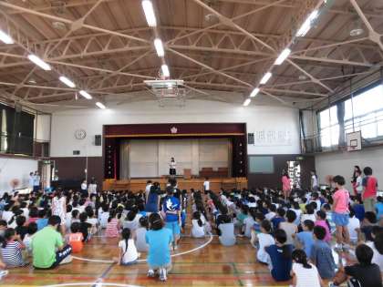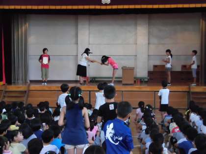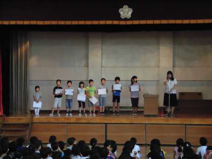 9月5日の全校朝会で夏休みの子供たちのがんばりを紹介しました。夏の水泳をすべて参加した子供たちに皆勤賞をおくりました。夏のラジオ体操に毎朝参加した子にも賞状が手渡されました。ラジオ体操は朝6時25分から行わる活動です。どちらも継続して取り組むことの素晴らしさを実現した子供たちです。全校の友達から大きな拍手がおくられました。