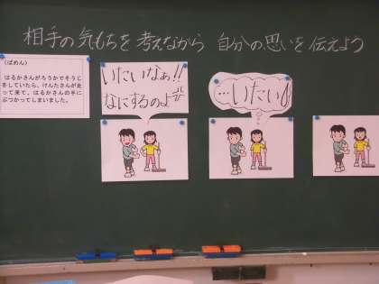 写真は2年生の様子です。2年生のすくすくタイムでは「相手の気持ちを考えながら自分の思いを伝えよう」というめあてで実施しました。イラスト見ながら、どんな声掛けや態度をとったら、お互いに気持ちよく生活できるか考えました。1年生は、「言えるかな?『ありがとう』と『ごめんなさい』」の学習をしました。3年生と4年生はあいさつ週間の取り組みについて話し合いを行いました。心と体の健やかな成長を育むすくすくタイムをこれからも大切にしていきます。