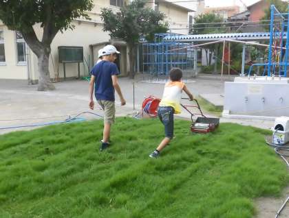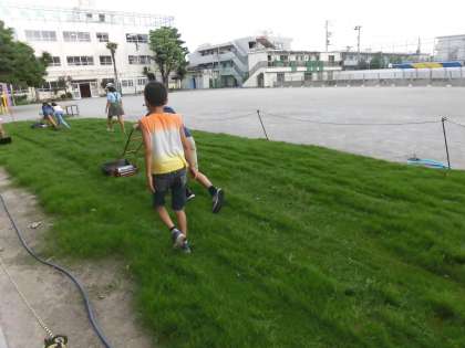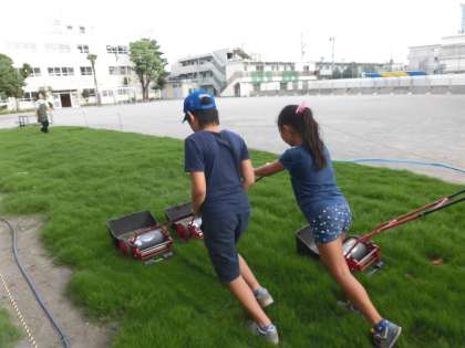 9月9日、9月の委員会活動が行われました。写真は整美委員会の活動の様子です。カメ小屋の清掃やエサやりを行うなど、カメを大切に育てている整美委員会の子供たちですが、今日は芝刈りの活動を行いました。夏の間、養生期間として大切に育てた芝生が緑いっぱい、ふさふさに生い茂りました。今日は芝刈りをして、芝生がさらに生き生き育つように手入れを行いました。もうすぐ養生期間を終え、芝生のスペースをオープンにする予定です。