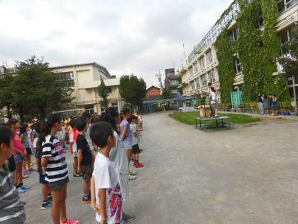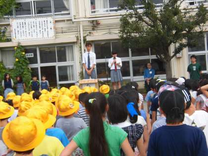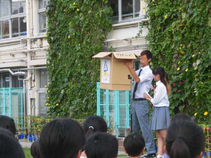 2学期もまた国際高校の生徒の皆さんとの交流活動が実施されます。9月12日は、全校朝会時に国際高校生2名が「リサイクローズ」の呼びかけを行いました。古着を集めて、世界で洋服を必要としている子供たちにおくる活動です。その架け橋を高校生の皆さんが担ってくれます。国際高校生の皆さんとは、これから3回ほどの授業交流も予定されています。子供たちの未来は「世界」に・・・すてきな交流活動になりそうです。
