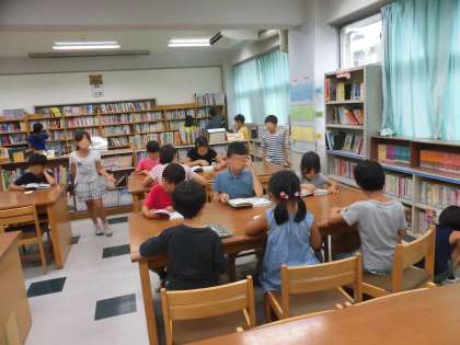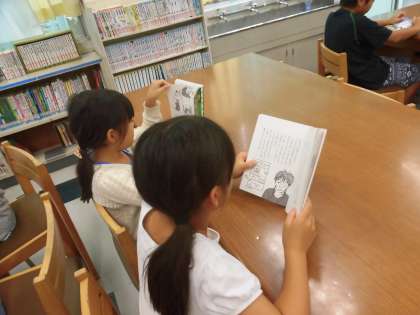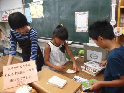 雨に日の20分休み、学校図書館にたくさんの子が集まりました。本の世界に入り込んでいるかのように熱心に本を読む子がたくさんいます。借りた本を返し、また新しい本を借りる子もいます。図書委員会の高学年も活躍しています。