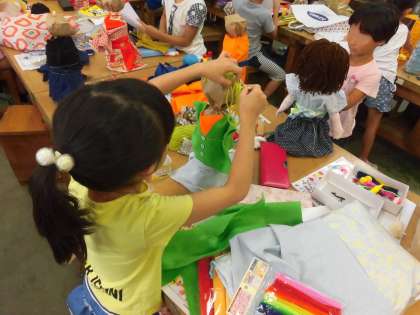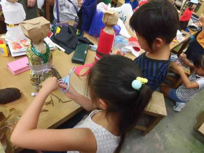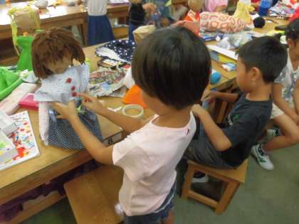2時間目が終わるころには、ペットボトル人形がアイディアあふれる作品に変わりはじめていました。アイディア図を見ながら洋服を工夫する子、手がのりだらけになりなりながらも髪の1本1本をていねいにつけていく子、友達とお互いのいいとこ見つけをしながらさらにすてきな作品を目指している子、みんな集中してがんばっていました。個性あふれる作品ばかりです。できあががりが楽しみです。