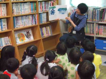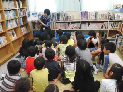 1年生の図書の時間の様子です。学校図書館担当の方の読み聞かせを熱心に聞いていました。