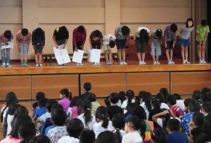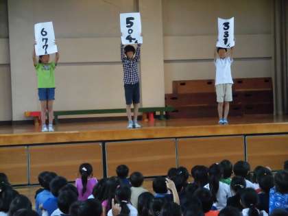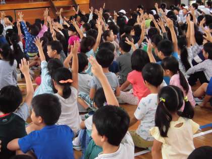 学校にある木の名前、開校時の児童数、初代校長先生の名前を問う3つのクイズが出されました。みんな一生懸命に考え、挙手をしています。正解の時は大喜び。最後に集会委員の子供たちから、「今日の開校記念日、みんなで76周年をお祝いする気持ちを大切にしましょう」と声掛けがありました。子供たちの学校を思う気持ち、とても大きく感じました。