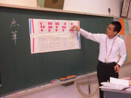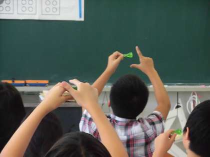 青光学園の先生から、点字を打つときは、点筆の持ち方と姿勢がとても重要になることを丁寧に教えていただきました。みんな先生の声掛けで、上手に点筆を持てるようになりました。力の入れ具合も習い、さあ、いよいよ点字を打つ練習です。