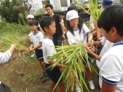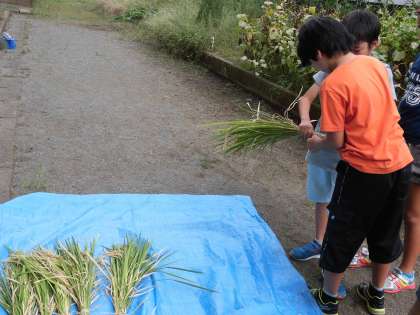 刈った稲を友達と協力してひもで束ねていきました。この稲を乾燥させ、お米になるまでの過程をこれから学習していきます。