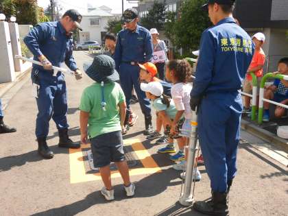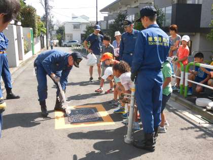 スタンドパイプを取り付ける実演と説明を熱心に見たり聞いたりする子供たちです。マンホールの下にある水道栓に思わず驚く子供たちの姿がありました。世田谷消防署・地域の消防団の皆様のご協力をいただきました。