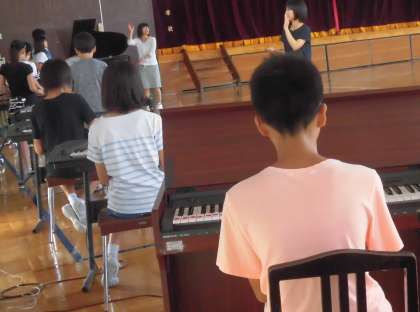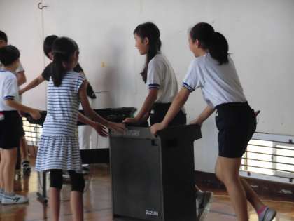 クイズが終わると、音楽委員全員で力を合わせて、行進曲の合奏です。背中からも子供たちの真剣さが伝わってきます。音楽朝会がすべて終わると、6年生がさっと動き出しました。楽器をみんなで協力して1階の音楽室まで運びます。この一連の6年生の動きは、池之上小学校6年生の学校のために働こうとする心の現れです。