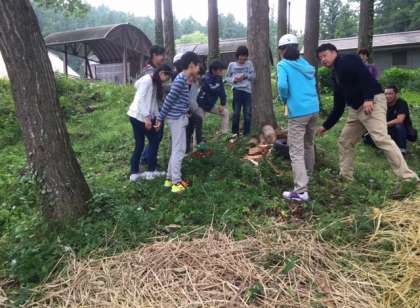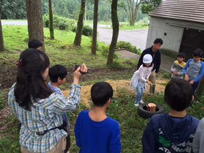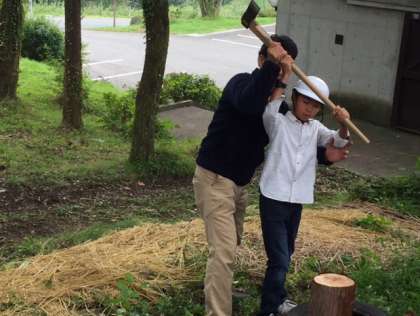 木を切る体験後は、薪割りです。コツをつかむのが難しかったけれど、一生懸命に薪割りに挑戦しました。