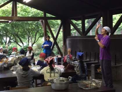 午後3時、飯ごう炊さん、カレー作りがはじまりました。みんなで協力して夕飯を自分たちで作ります。最初に手順、料理の効率、そして安全についてのお話がありました。カレー作りとご飯炊きに分かれて活動開始です。