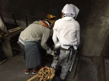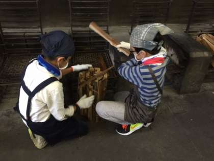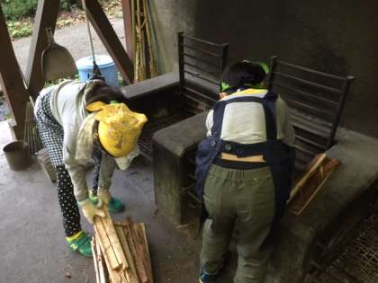 火起こし担当の子は、自分たちのアイディアで、火を起こしやすいまきの置き方を工夫しています。よく話し合っています。みんなで協力する態度が立派です。