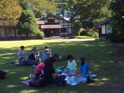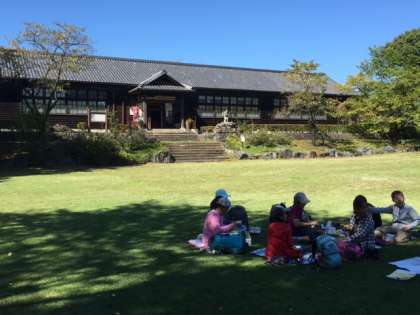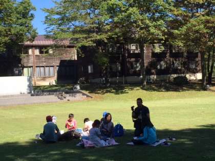 みんなで一緒に食べる最後の昼食です。旧川場小学校である民族資料館の芝生広場で食べました。きれいな空気と豊かな自然の中でのお弁当、残さず食べた子が多かったです。