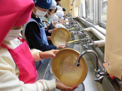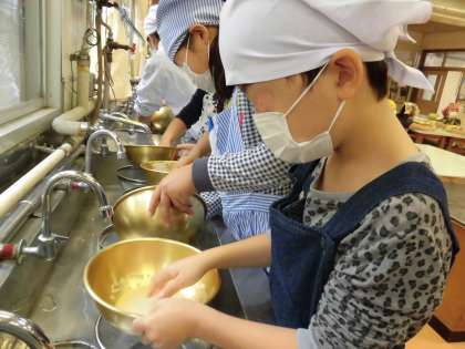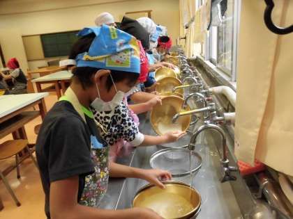 三角巾、マスク、エプロンを用意して、しっかり身支度を整えます。みんなの真剣さが伝わってきます。