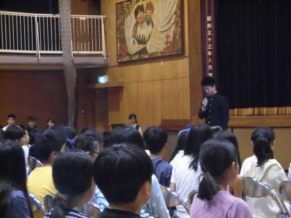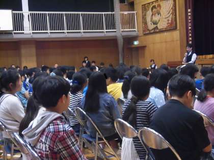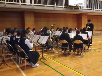 授業の様子や学校の施設を案内していただいた後は、体育館で全体会が開催されました。生徒会の皆さんが楽しく学校を紹介してくれました。質問コーナーでは池之上小学校の6年生がたくさん質問し、会を盛り上げていました。ブラスバンド部のすてきな演奏を聴くこともでき、中学校へのあこがれの気持ちを抱くことができました。