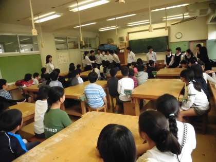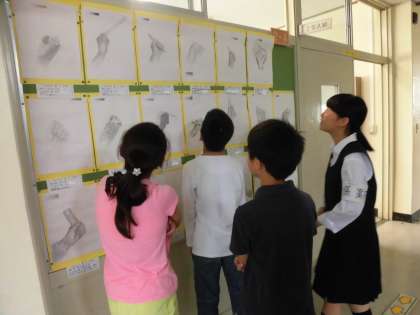 10月14日、富士中学校において新入生説明会が開かれました。富士の学び舎の4校の小学校が集まりました。代沢小学校、多聞小学校、花見堂小学校、そして池之上小学校の4校です。5時間目は富士中学校全体で授業を公開してくださり、中学3年生の案内で学校見学を行いました。一つ一つ丁寧に説明してくれる中学3年生の皆さん。時には笑いを交えながら一生懸命に説明してくれました。池之上小学校6年生もその説明を一生懸命に聞いていました。中学生と小学生のすてきな交流場面です。