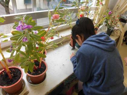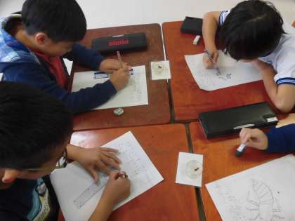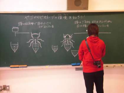 ビオトープの中で見つけた生き物は、子供たちがていねいに教室に運び、観察を行いました。顕微鏡でヤゴの体のつくりの細部まで観察し、トンボの種類による個体差を見つけていきました。