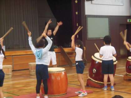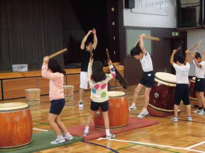 和太鼓体験を通して子どもたちの呑み込みの早さと協力する心の大きさに感動しました。2時間の体験活動でしたが、子供たちの和太鼓の技術はぐんぐん上達していきました。何よりすばらしかったのは、最後のチームプレイです。「ドン! ドン! ドン!・・・・ドドドドドド・・・」太鼓をたたく速さが増します。音を小さく変化させていくと、今度は大きく打っていきます。そしてまた「ドン! ドン! ドン!」とゆっくり打ち付け、太鼓をたたく音が消えます。消えたころを見計らって、誰かが「そーれ!」と掛け声をかけます。その声に合わせて最後にみんなで「ドン」と大きな音で締めます。この一連の動作を話し合うことなく、互いの様子を受け止めながら、なんと15人ほどのグループで行うのです。子供たちは友達にの様子に心傾けながら、音をたたいていきます。どのグループも一連の流れをしっかりとやり遂げることができたのです。周りを意識する心配りと、自分の音を大きく鳴り響かさせる勇気、この二つの動作を行うことができた子供たち。すてきな和太鼓体験になりました。