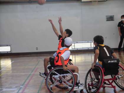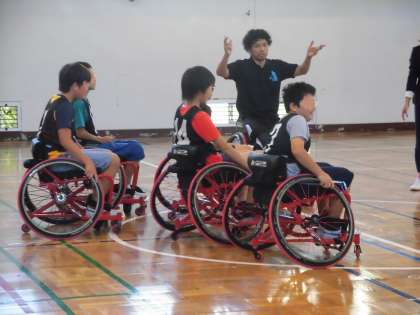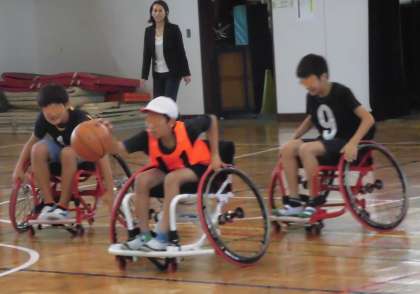 パス・シュート・ドリブル、そして車椅子の動かし方、子供たちはゲームをする中でどんどんこつを習得していきました。男子チームは白熱した試合を繰り広げ、2対2の同点でした。各クラスの応援も盛り上がりました。この応援について、堀江選手、スタッフの皆様から、子供たちの一致団結するすばらしさをほめていただきました。