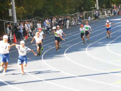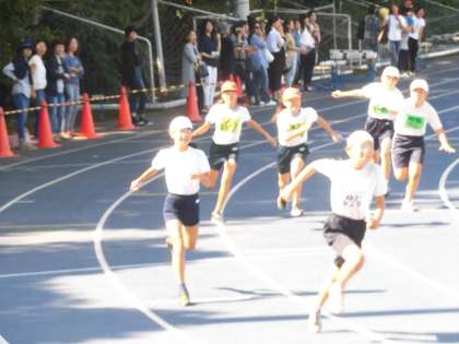 リレーの様子です。どの学校も精鋭の選手たちです。白熱した走りに応援の声がグランドに響き渡りました。