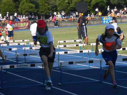 いよいよ競技のはじまりです。それぞれがエントリーした種目でがんばりました。種目によって場所が異なりますが、池之上小学校の子供たちの心は一つにつながっているようでした。みんながんばりました。写真は、ハードル走の様子です。