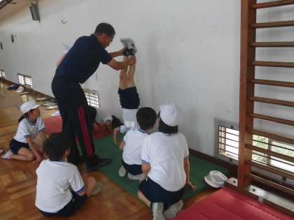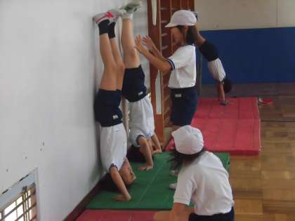 これまで学習してきた技を練習する子供たちの様子です。特に頭倒立や補助倒立は、安全に十分に気を付けながら場を設定し、友達と声をかけ合いながら練習を続けました。