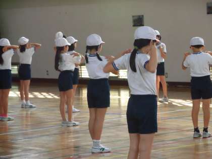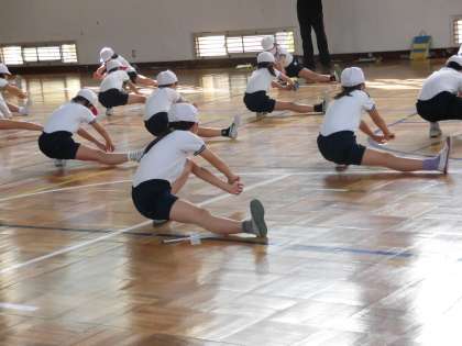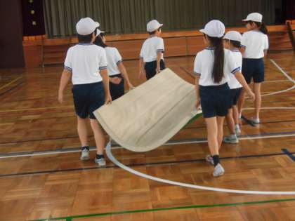 4年生の体育の授業の様子です。マット運動を行っています。子供たちの準備体操を見ていると、どの部分をどのように動かしたほうがいいのか、しっかり理解してる様子です。つま先を上げこと、体をしっかり伸ばすことなど、運動の特性に応じて体を十分に動かしていました。場の準備もてきぱきこなします。友達と協力する姿も見られました。