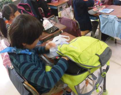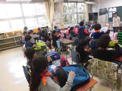 10月28日、曇り空ではありますが、1・2年生が遠足に出かけます。今日は2年生と1年生が仲良く助け合って楽しい1日を送ってほしいと思います。出発前の荷物確認をしている様子です。では、元気に「行ってきます!」