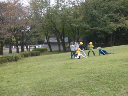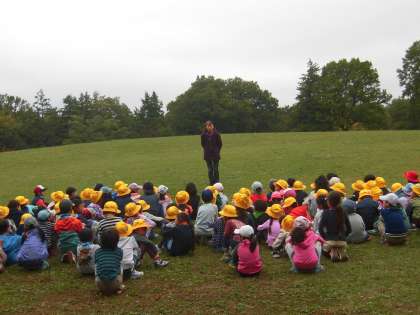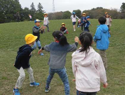 思い切り遊ぶことのできた1・2年生。先生が鳴らす笛の音が聞こえると、あっというまの集合ができました。2年生のリーダーが声をかけ、班ごとに並びました。これからの予定を聞く子供たちの態度も立派でした。