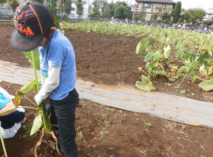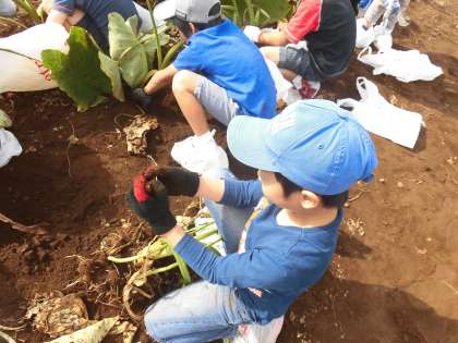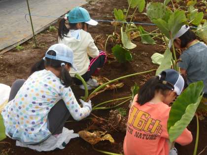 土からさといもが顔を出しました。「重たいよ」「たくさんお芋がついているよ」と、子供たちから声が上がります。お芋を一つ一つ取り分けていくと「パキッ!」と気持ちのいい音がします。「ぼくの音、聞いて。いい音がするよ。」自然が生み出す音や感触を存分に味わいました。