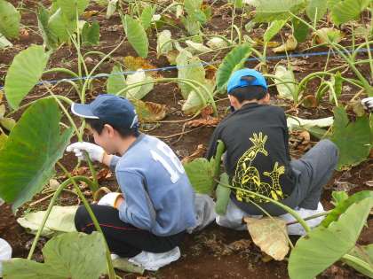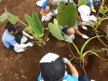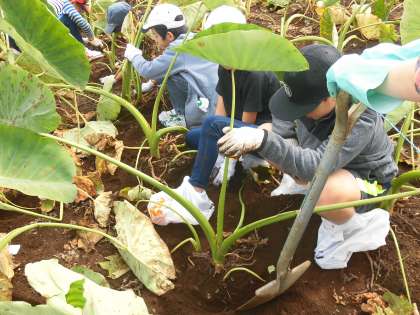 教えていただいたように、さといもを上手に収穫する子供たち。みんな真剣です。子供たちは、自分の靴の上にビニル袋をかぶせました。道路や、後から乗るバスが汚れないようにするための心配りです。