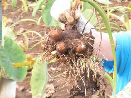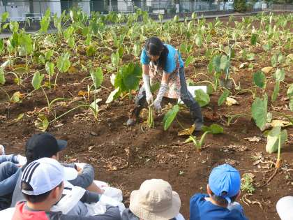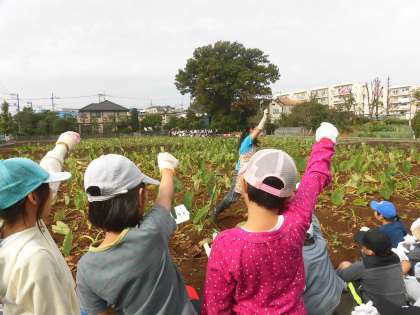 さといもが土から顔を出すとみんな大歓声です。「これからたくさんさといもを掘るぞ!」とみんなで気合を入れました。