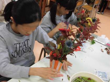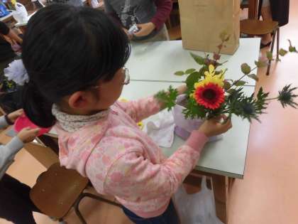 子供たちは、花と対話をしながら自分の世界を表現していきました。今日生けたお花と花瓶、剣山は「花ボランティア」「ワンコインクラブ」の皆様から、子供たちに贈られました。自分で生けた花をぜひご家庭に飾っていただき、花の一生を感じ取ってほしいという願いからです。今日、一生懸命に生けた花を持ち帰ります。どうぞご家族の皆様でお花を楽しんでいただければと思います。