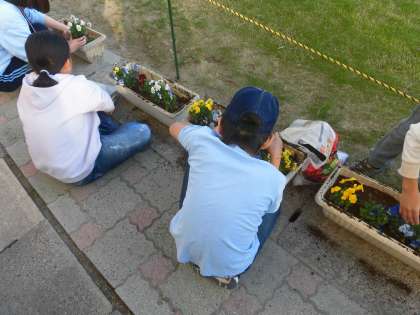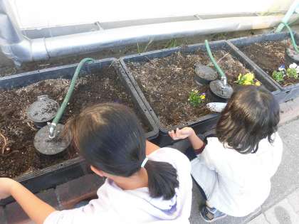 プランターへの植え付けが終わった子は、学校の花壇にチューリップとパンジーを植えました。これから花を豊かに咲かせ、株を大きくしながら育っていくパンジー。春にはチューリップも花を咲かせます。お世話をするのも楽しみです。花壇の土からは幼虫もたくさん発見でき、子供たちは花や土と触れ合う活動を楽しみました。