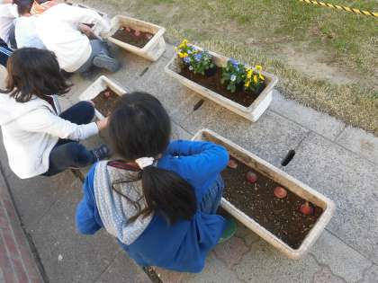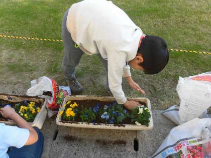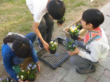 パンジーの花の色を考えながら、5株選び、プランターに植えました。どの花を選ぶかは子供たちが考えました。このパンジーにはおいしそうな名前がついています。黄色い花は「パイナップル」、白い花は「ミルクセーキ」、赤い花は「クランベリー」、そのほかにも「ソーダ」などおいしそうな名前がついています。園芸農家の皆様が大切に育てていることがよくわかります。