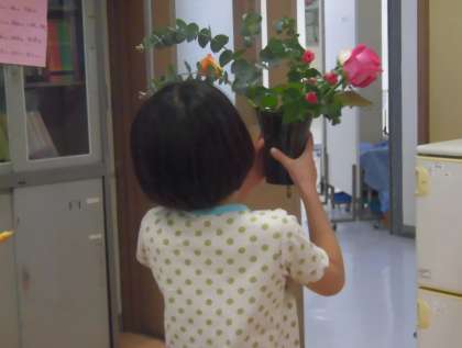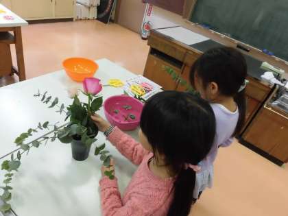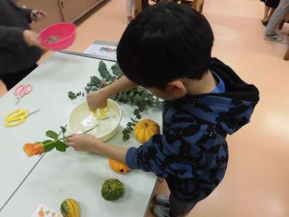 水切りもすっかり慣れた手つきです。葉っぱの広がりや花の位置にこだわりながら作品が完成しました。大切に教室に持ち帰ります。