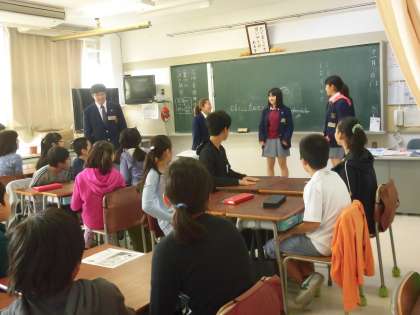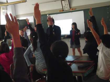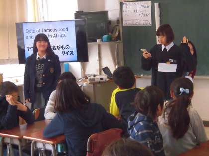 6年生には、アメリカ・メキシコ・韓国・中国・南アフリカ・エチオピアの紹介やクイズ、ゲームなどを行ってくれました。